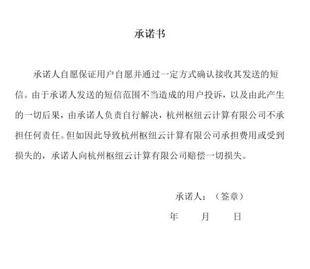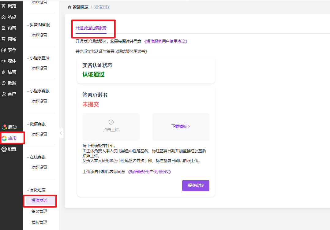 阅读并同意《短信服务用户使用协议》,下载并签署《短信服务承诺书》(打印后签字盖章,再拍照上传),提交审核(审核通过后才能使用短信功能)。