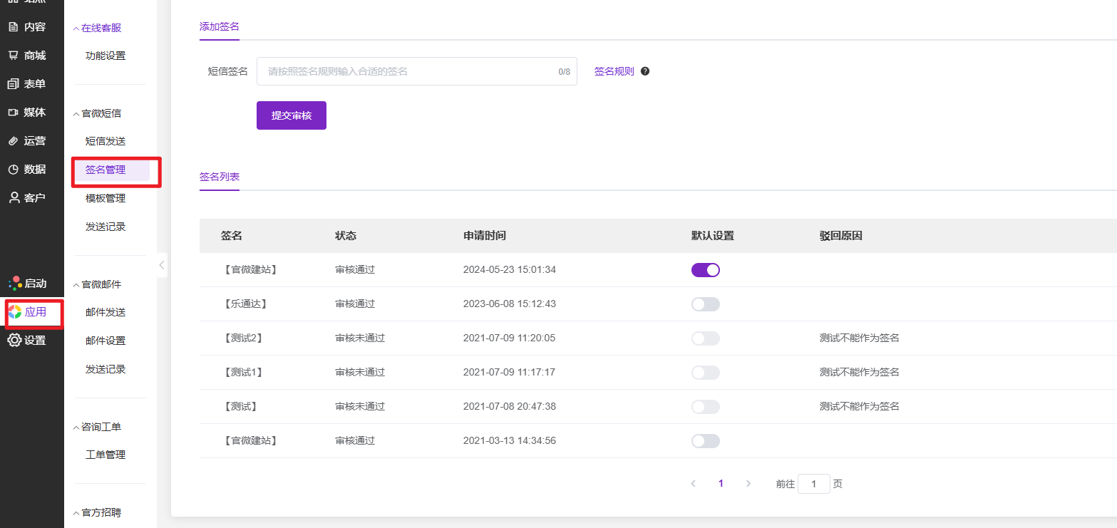 进入「官微短信」→「签名管理」→ 点击「添加签名」: