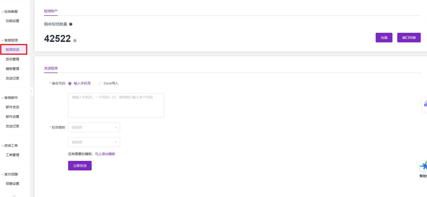 1、短信服务需购买短信套餐包(在「短信发送」页面可查看剩余短信数量并充值);