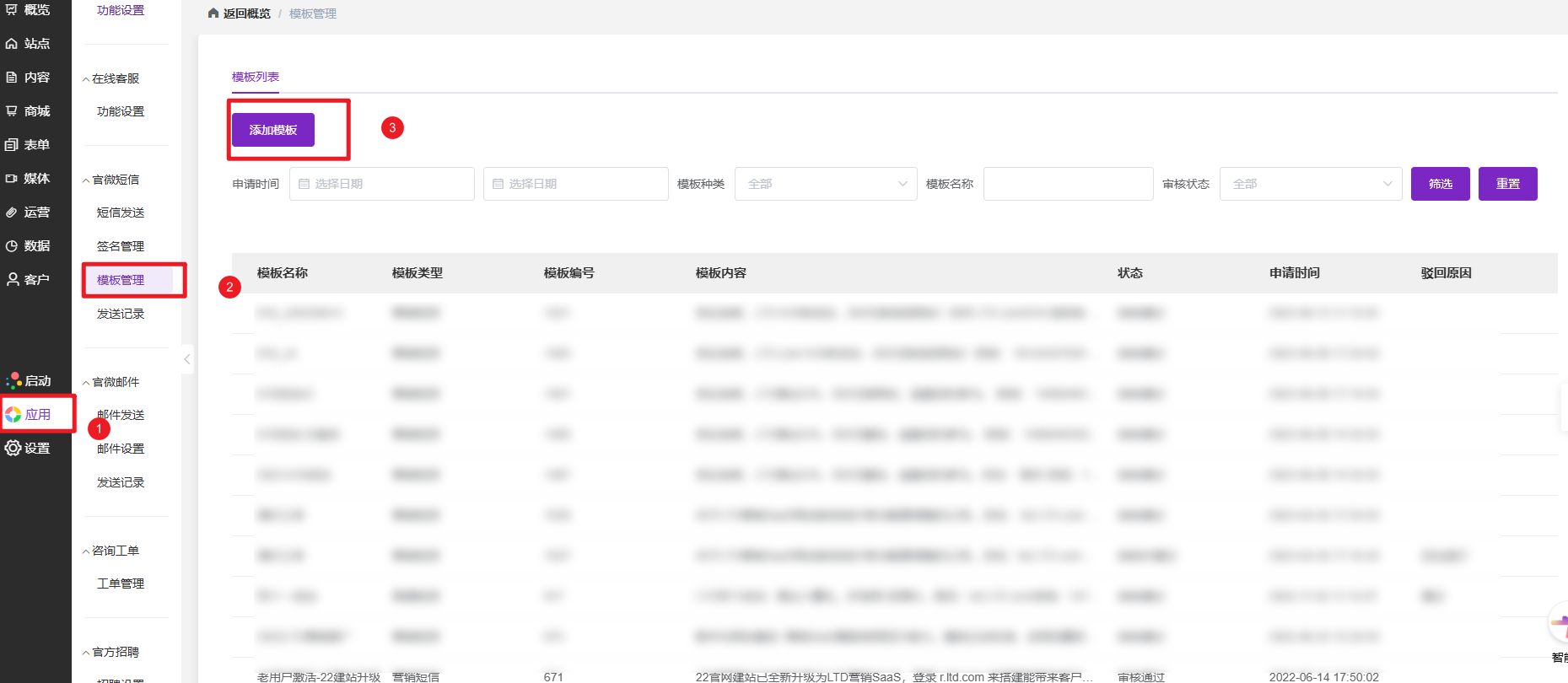 进入「官微短信」→「模板管理」→ 点击「添加模板」: