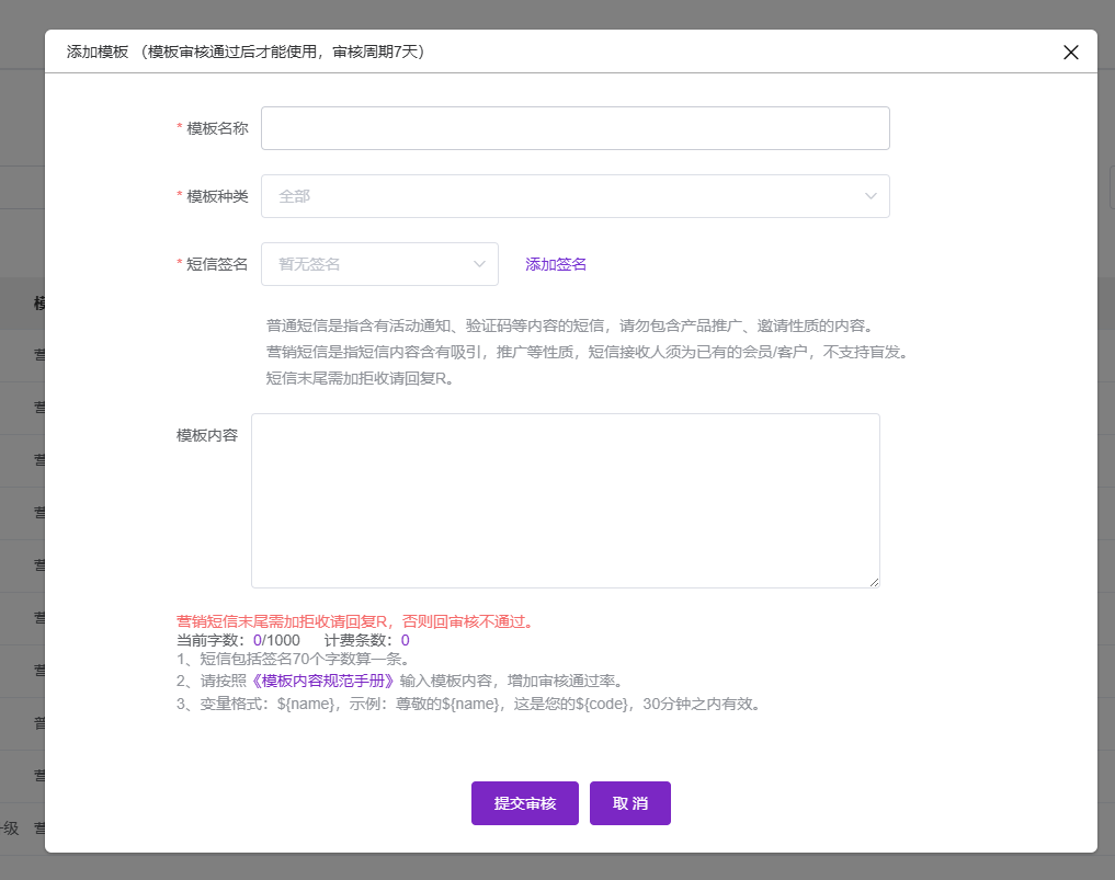 2、签名、模板的审核需符合运营商规范,若被驳回需按提示修改后重新提交。