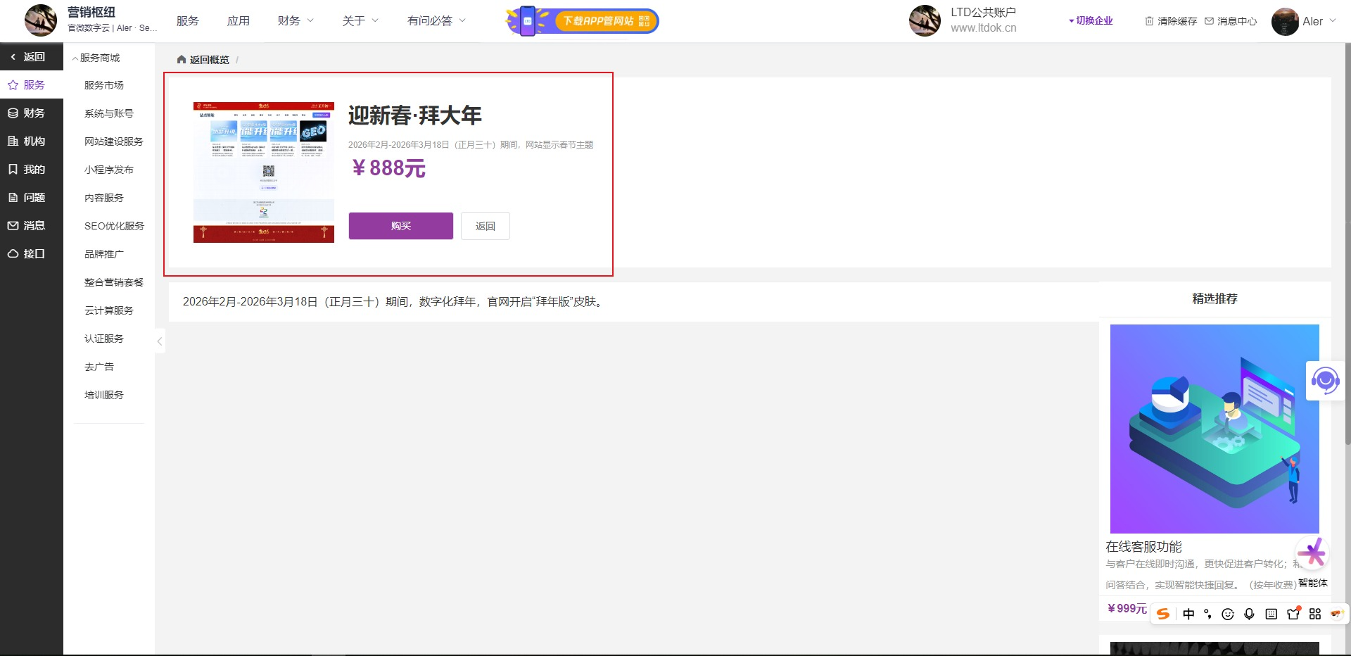 在 “春节主题” 模块右侧,点击「去服务市场购买」按钮,跳转至服务市场的「迎新春・拜大年」服务购买页。在购买页确认服务内容后,点击「购买」按钮完成支付。