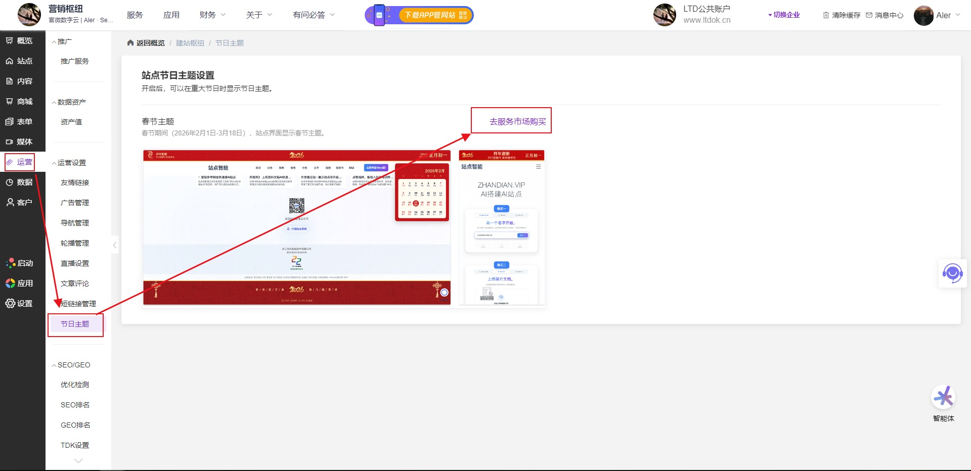 登录营销枢纽后台,点击左侧导航栏「运营」→ 在「运营设置」分类下找到「节日主题」,进入【站点节日主题设置】页面。