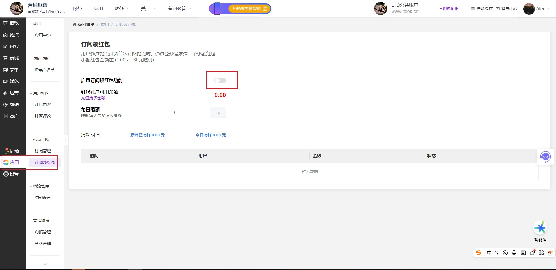 返回营销枢纽后台,点击左侧导航栏「应用」→ 在「站点订阅」分类下找到「订阅领红包」,进入【订阅领红包】设置页面。