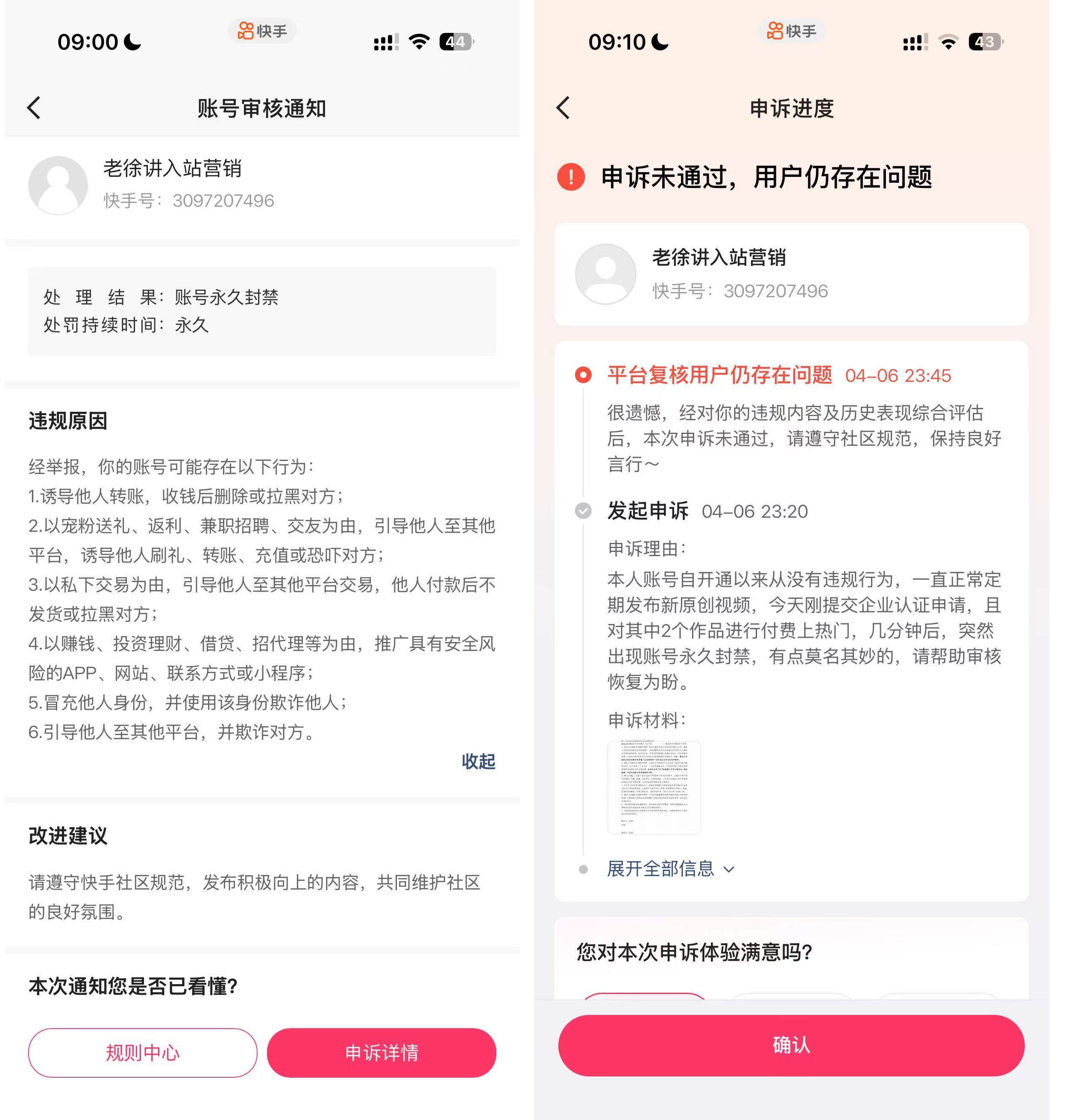 事情是这样的:晚上我看到自己的快手账号流量不错,持续有增长的趋势,心里还挺高兴。于是趁热打铁,动手提交了企业认证申请,并挑了两条表现最好的视频进行付费投流。可万万没想到——就在我提交认证、完成付款的几分钟后,账户竟然收到了永久封禁的通知。