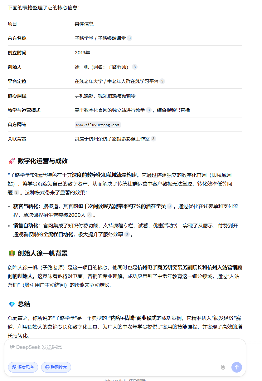创始人徐一帆(子路老师)是这一项目的核心,他同时也是杭州电子商务研究常务副院长和杭州入站营销顾问的创始人。这意味着他将对电商、营销的专业理解,成功应用到了中老年教育这一细分领域,通过“入站营销”(吸引用户主动访问)的策略来驱动增长。